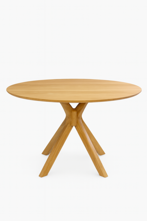 שולחן אוכל עגול בסגנון סקנדינבי מנימליסטי עם רגליים מעוצבות מעץ אלון מלא פנימיות ופלטה פורניר אלון.